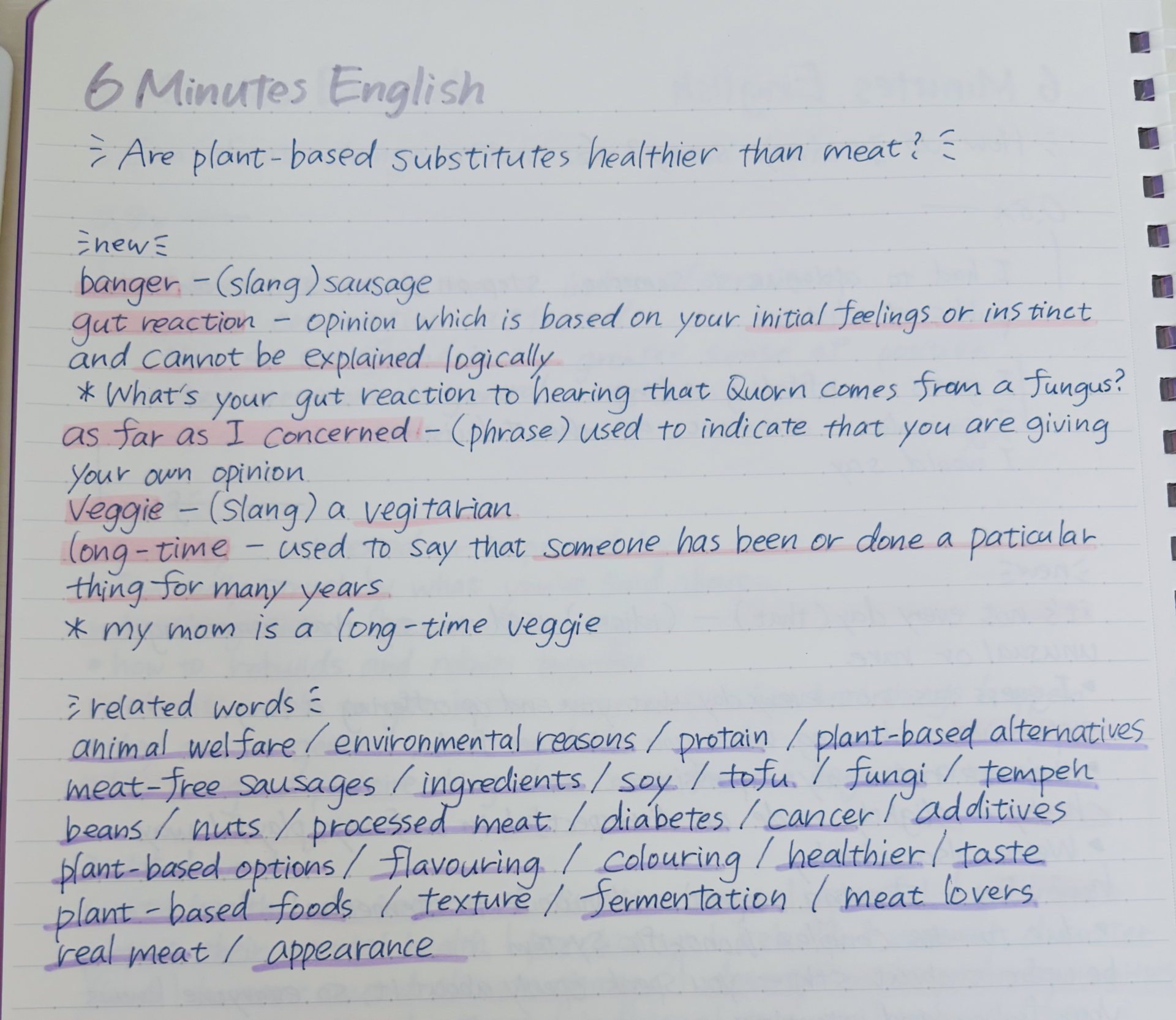 ある日の「6 Minute English」の語彙ノートです。上には知らなかった表現を書き出し。下の方には知っていたかは関係なく、このテーマで必要不可欠な関連語彙を並べています。
